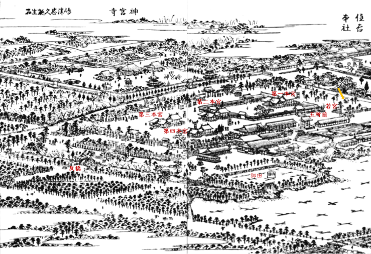この時期、すでに斯主社は第一本殿(底筒男命)の北側、瑞垣外の通路に面した御文庫の東側に、神馬舎があり背後に西に向けて祀られる「国盛神祠」すなわち「斯主社」があったことが分かる。