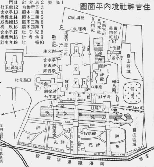下図は、昭和8年発行の鉄道省編『日本案内記-近畿編』に載せられた住吉神社境内図で、第一本殿北側に斯主社が一時祀られていた。