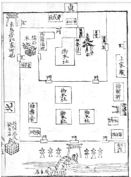 ⑤ さらに古い『住吉名所鑑』(享保2年[1717])にも、略図として「住吉社中図」に御本社(第一神殿)の瑞垣南側に付属した「供養法所」(異国降伏供養法所)の横に、五所前の「た満乃杦?」の大木と「若宮」、少し東側背後には「國盛社」と記してその位置を示している。