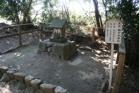 今回とくに注目する末社として、本社の北東約650mの段丘端近くの境外に祀られている津守神社(祭神 田裳見宿禰(たもみのすくねのみこと))がある。境内には饌川水(おものがわ)神社(祭神 罔象女(みずはのめ)命)がある。これらの神社と神々については、改めて詳述し検討することとする。